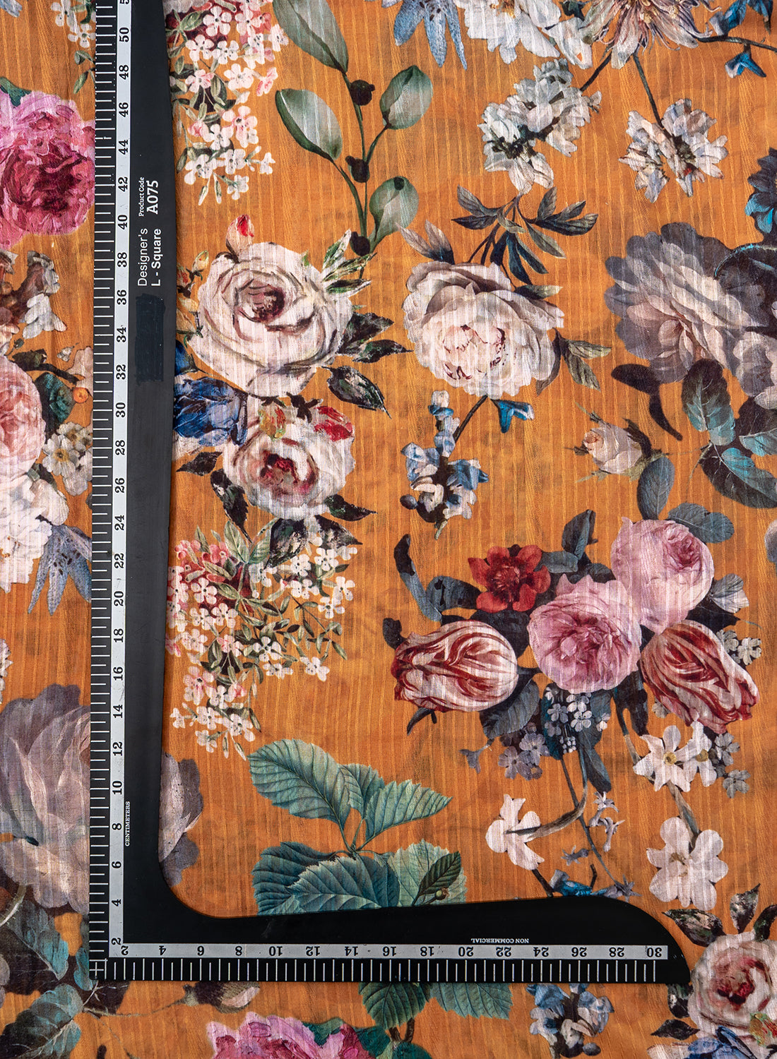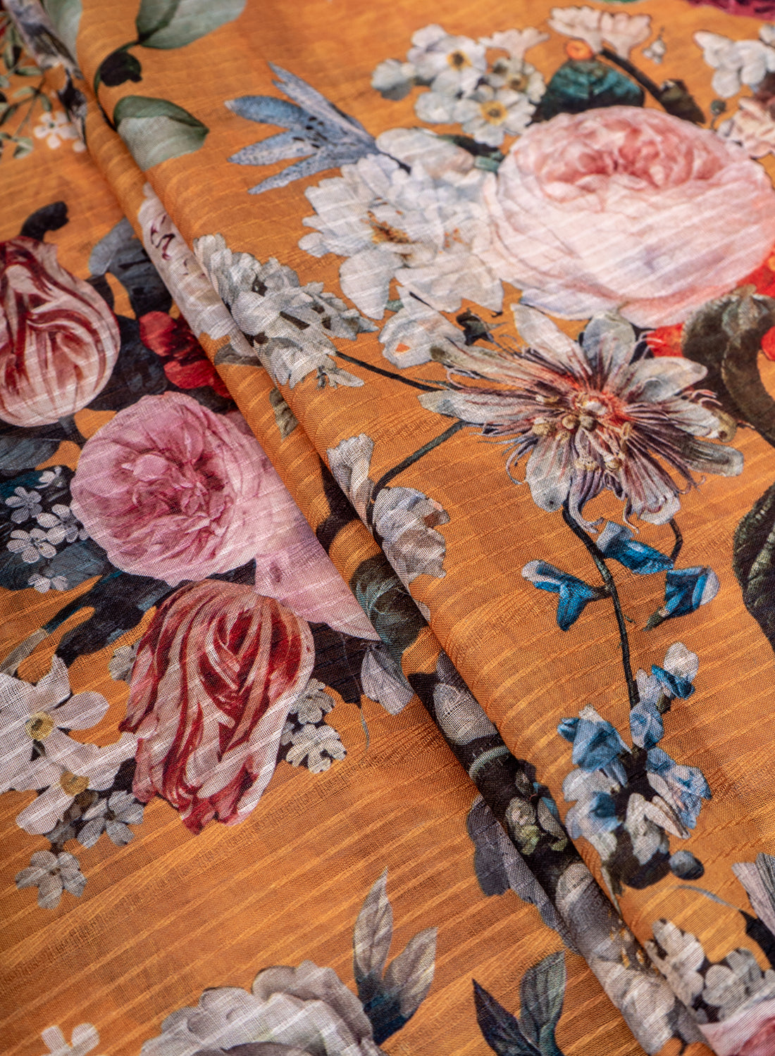 Cotton Mulmul Jacqurad Mustard Yellow Color Floral Digital Print Fabric.