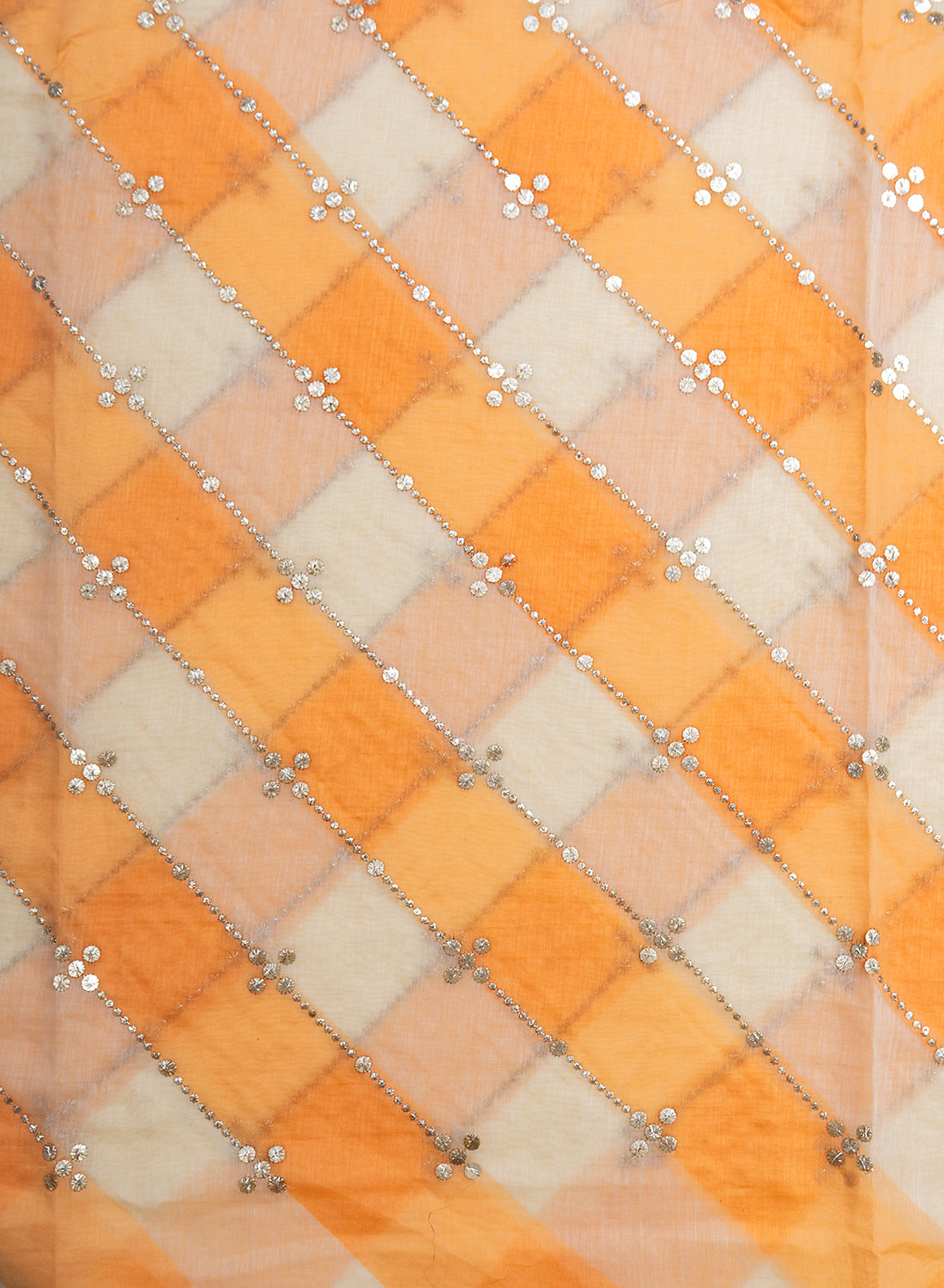 Mul Chanderi White and Orange Color Brush Print Stripe Pattern Embroidery Fabric.