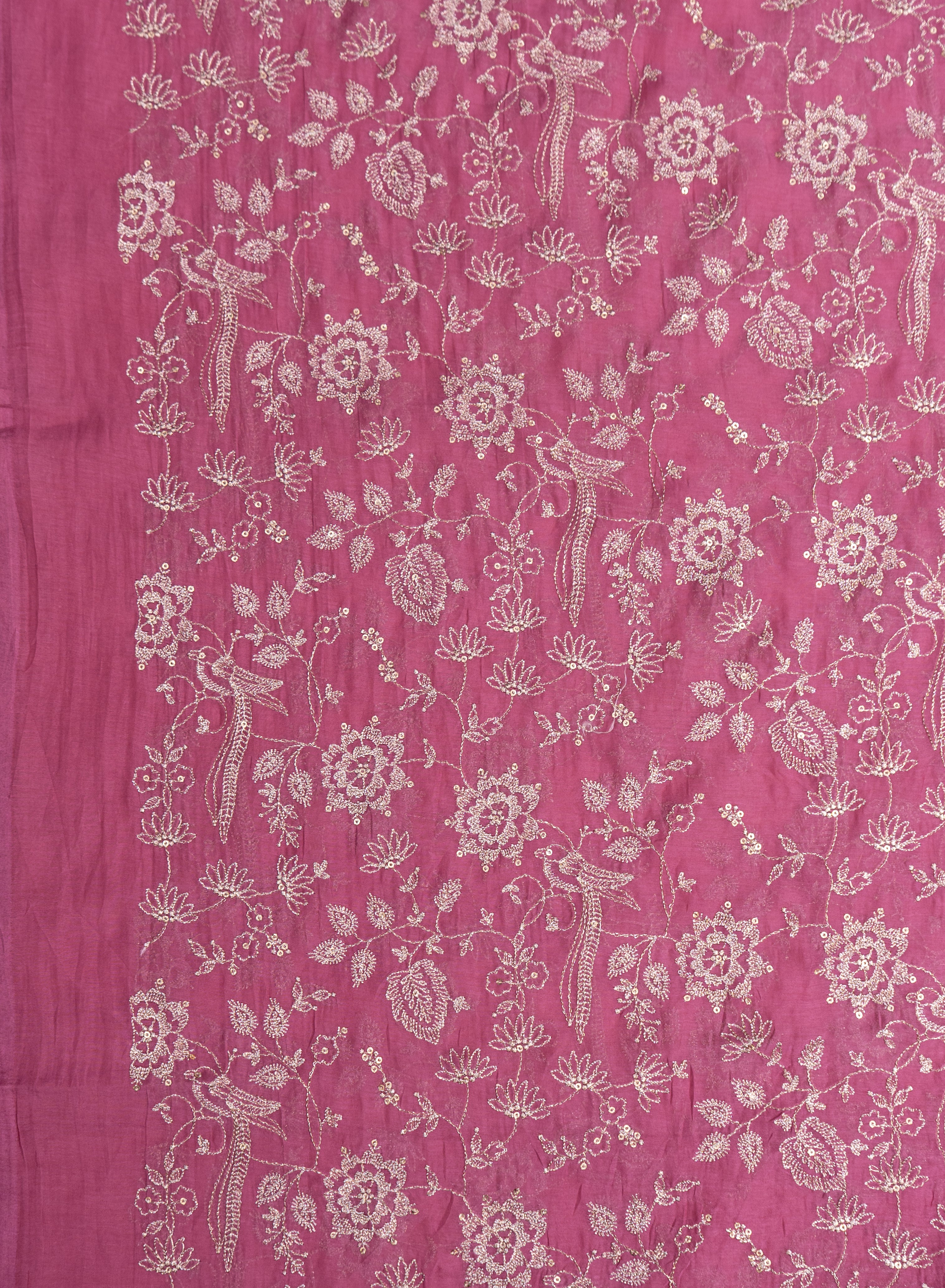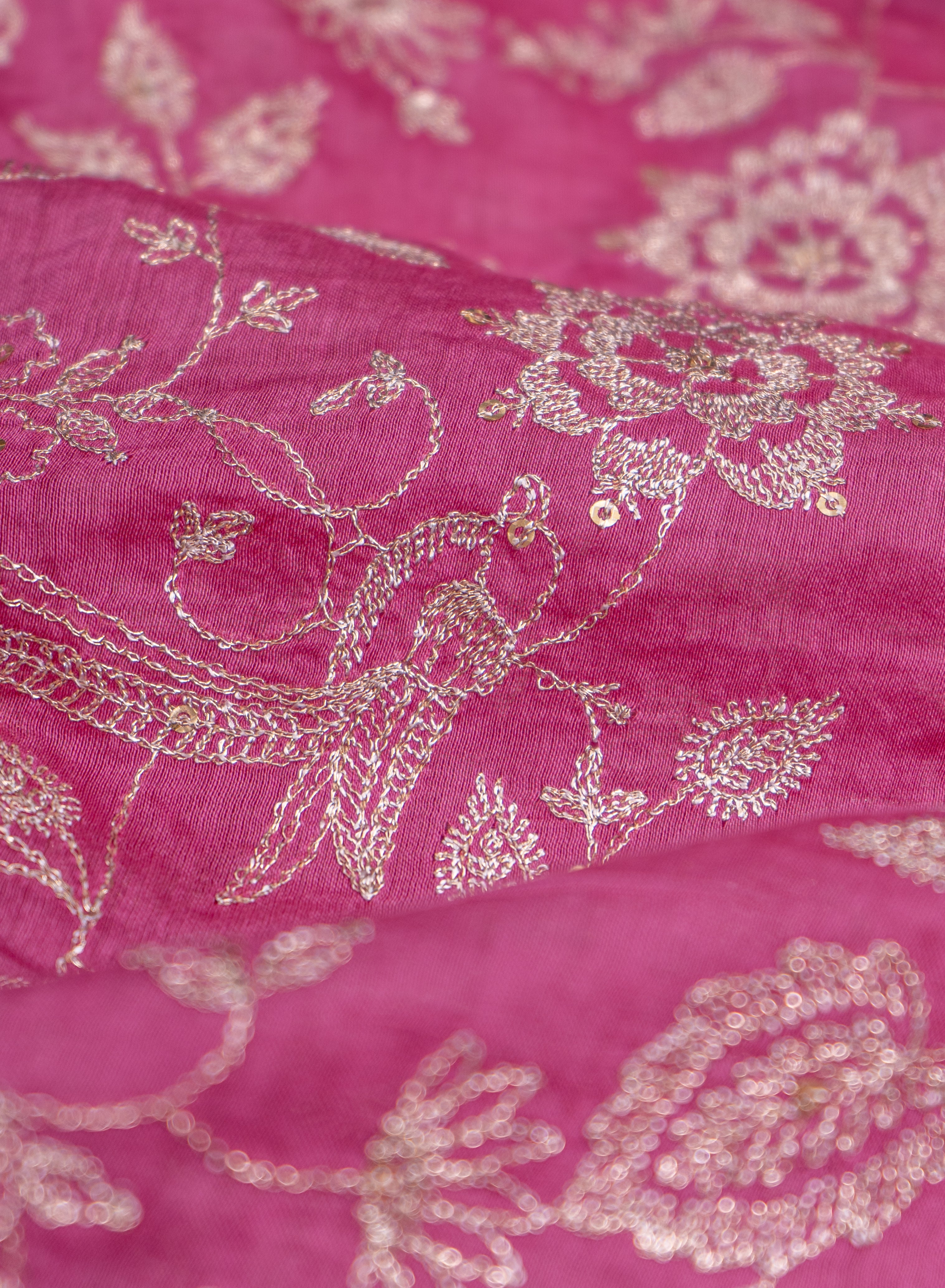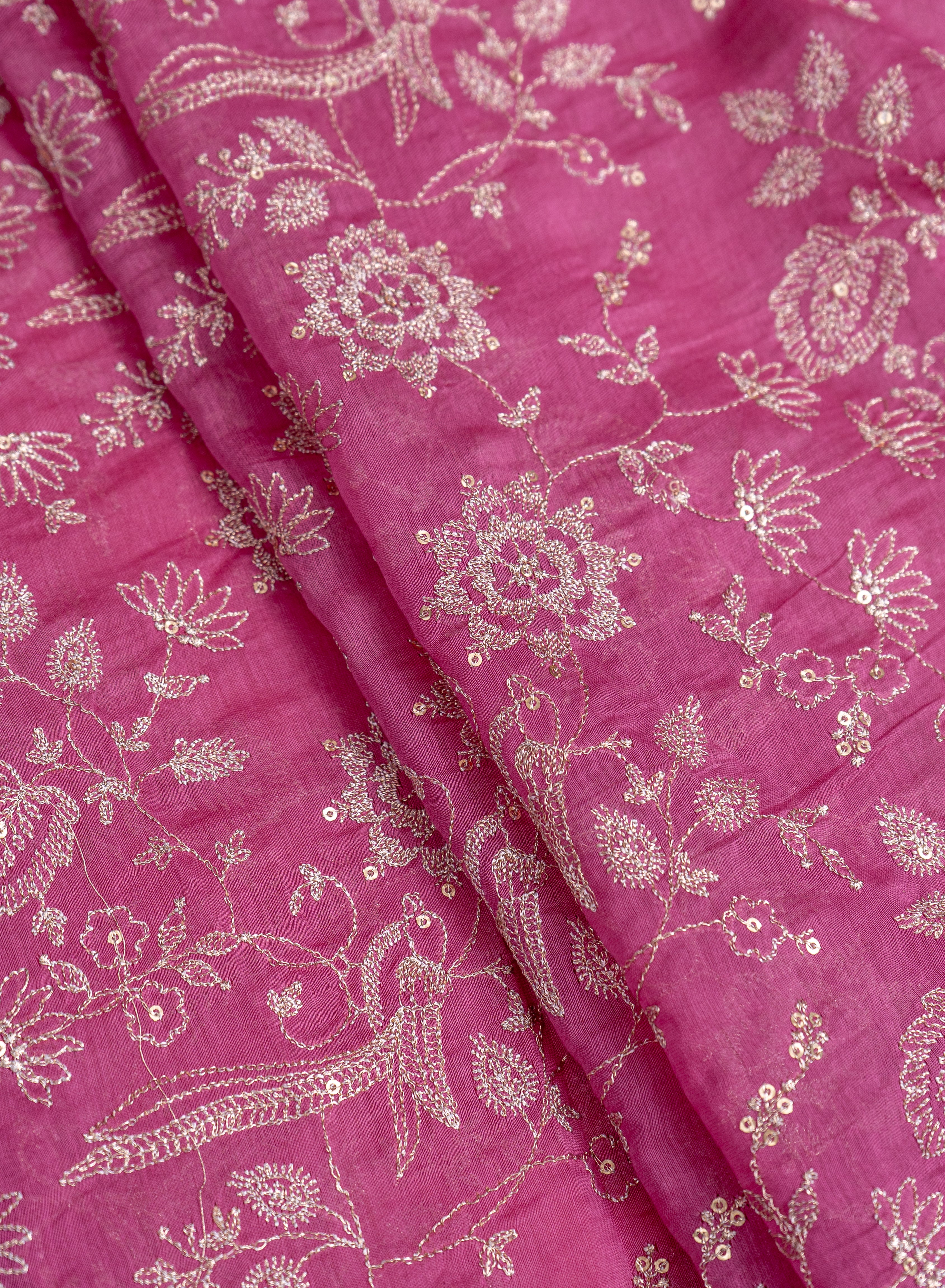 Mul Chanderi Wine Color Floral Pattern Embroidery Fabric.