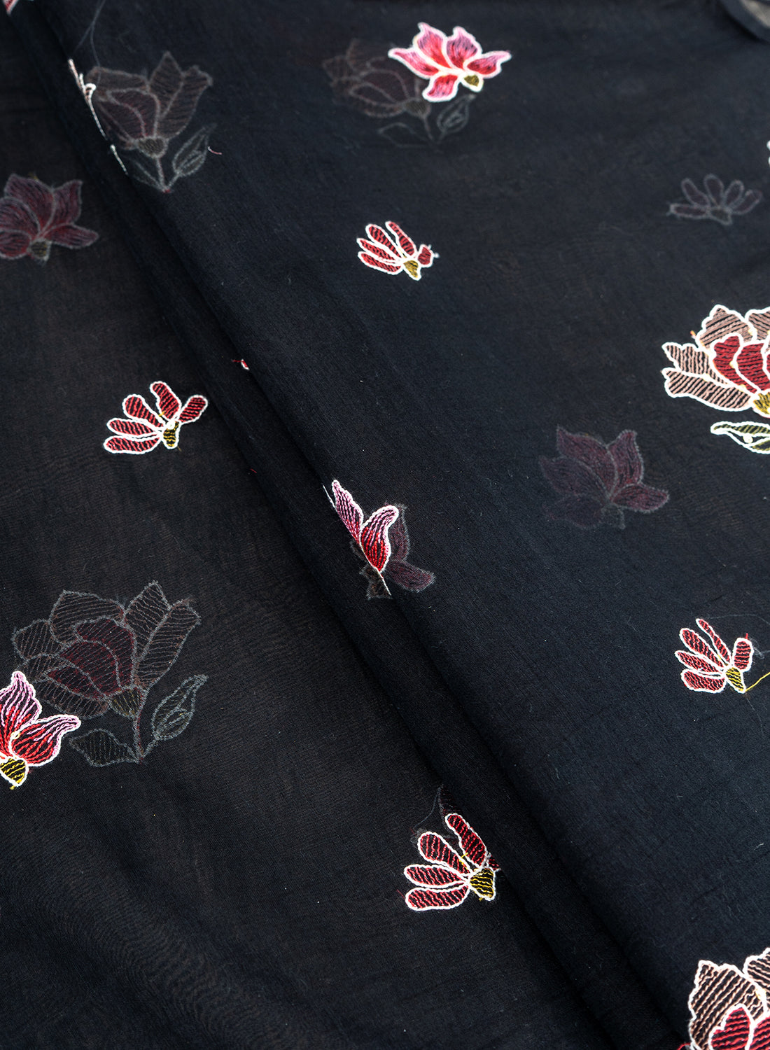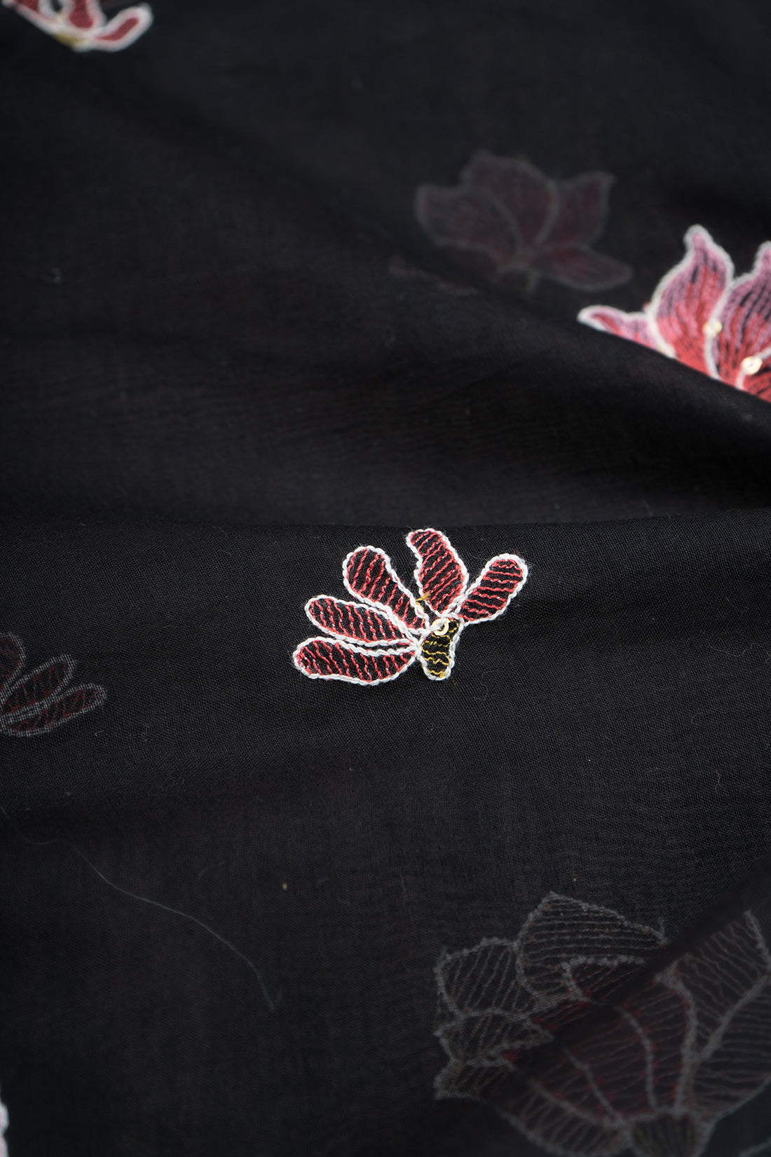 Pure Chanderi Black Color Floral pattern Resham Embroidery Fabric.