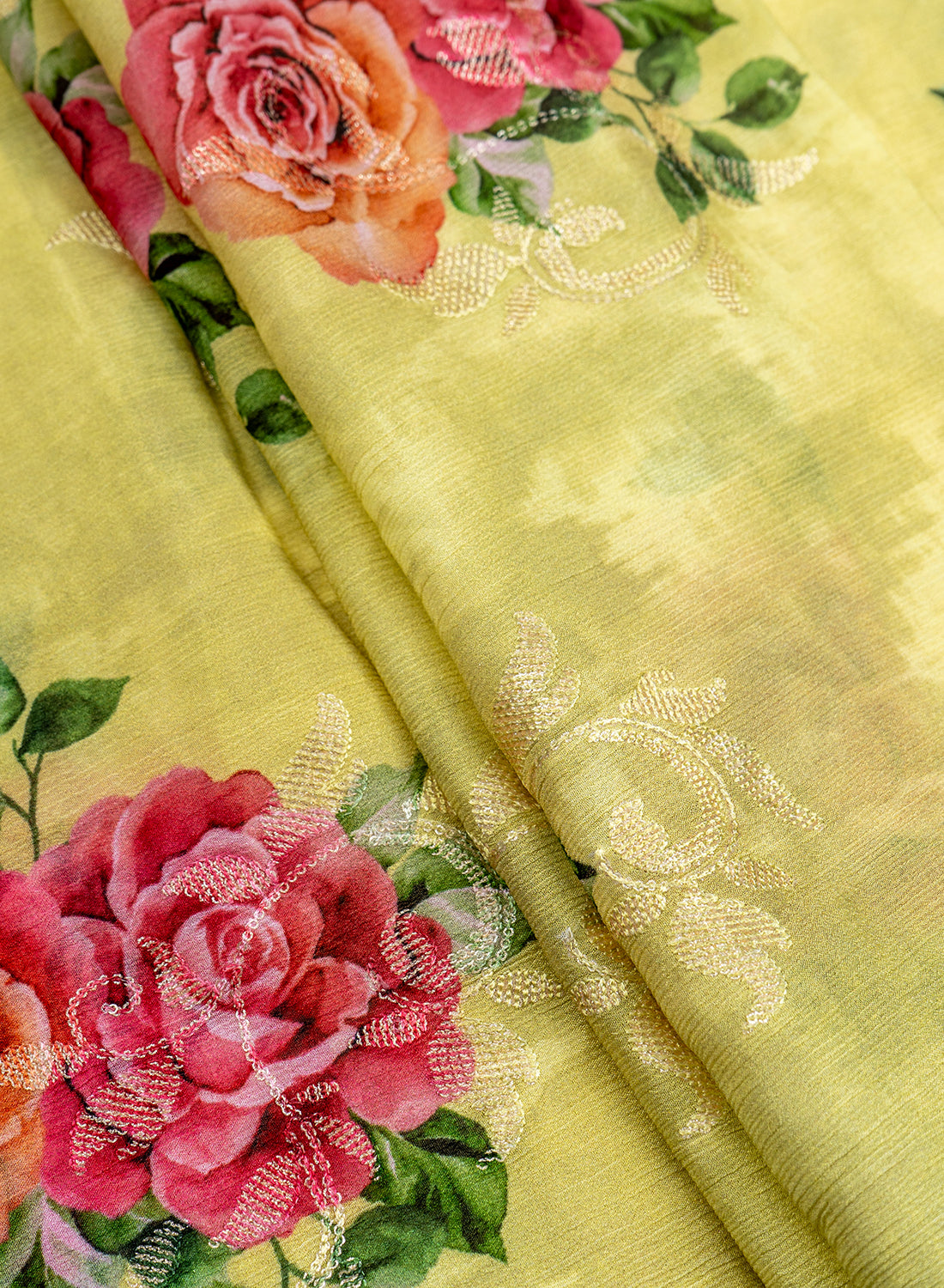 Pure Chinnon Chiffon Lime Green Color Floral digital Print Sequins Embroidery Fabric.
