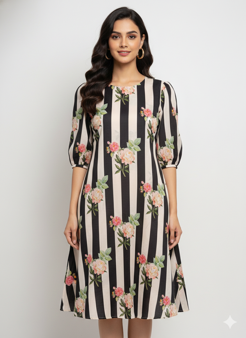 Pure Muslin Black Color Thick Strips Digital Printed Fabric with Kupi Work