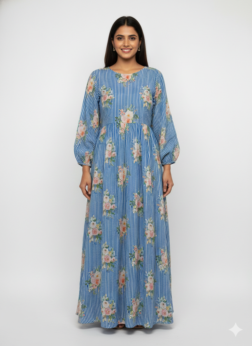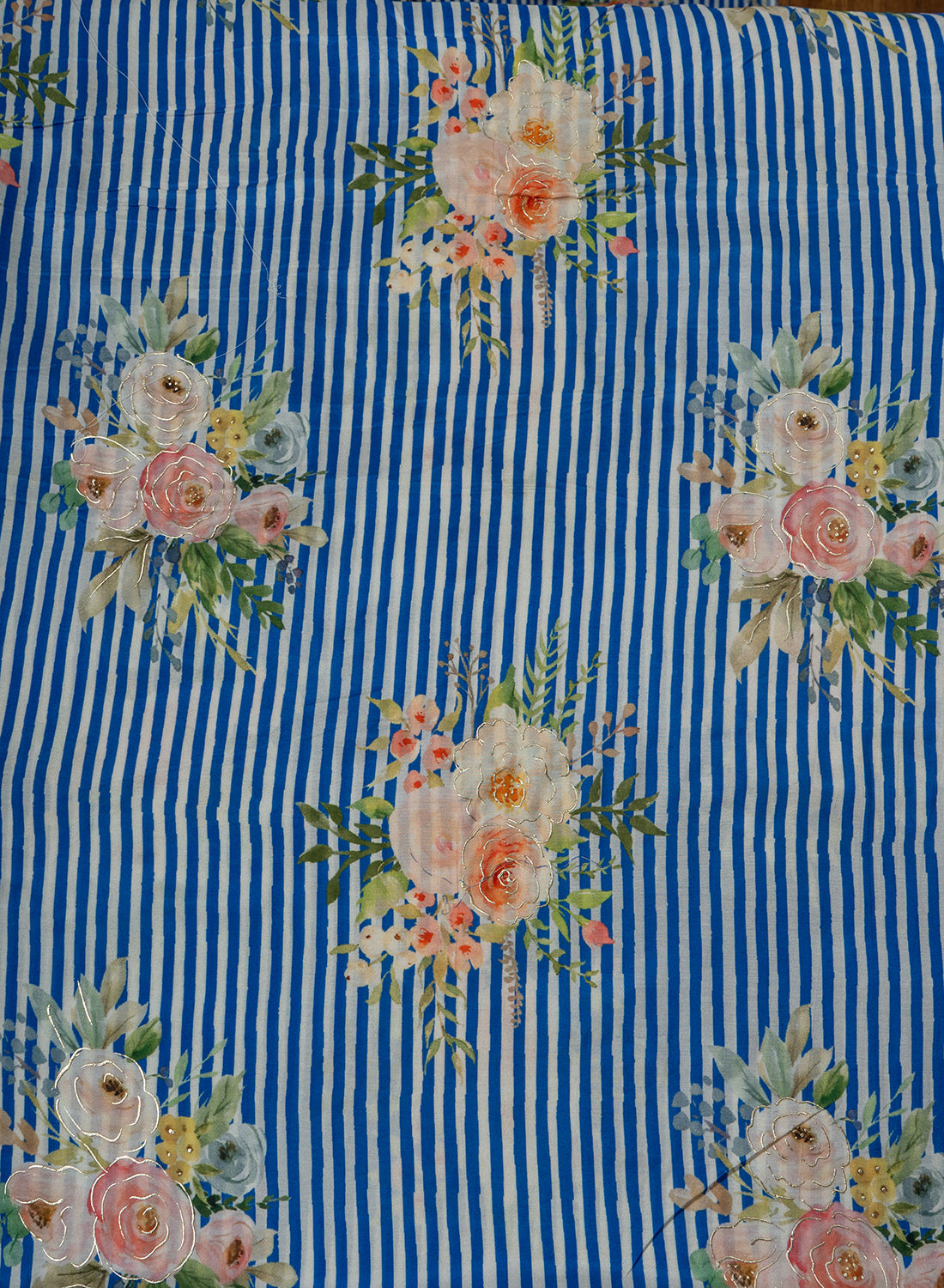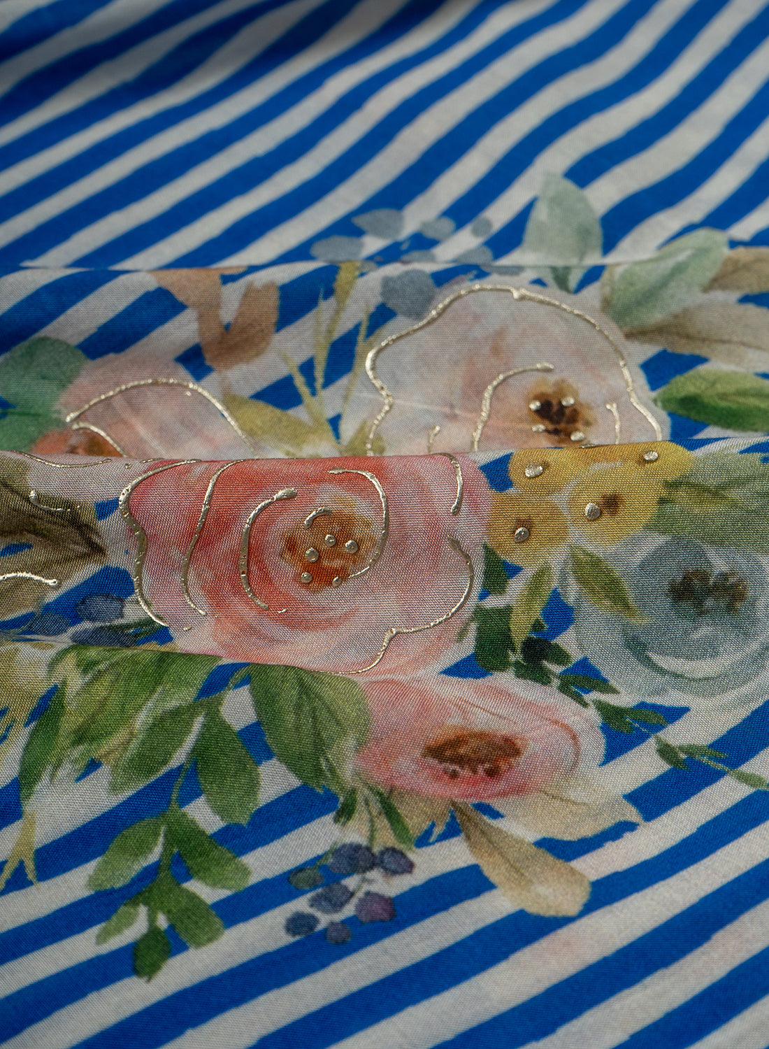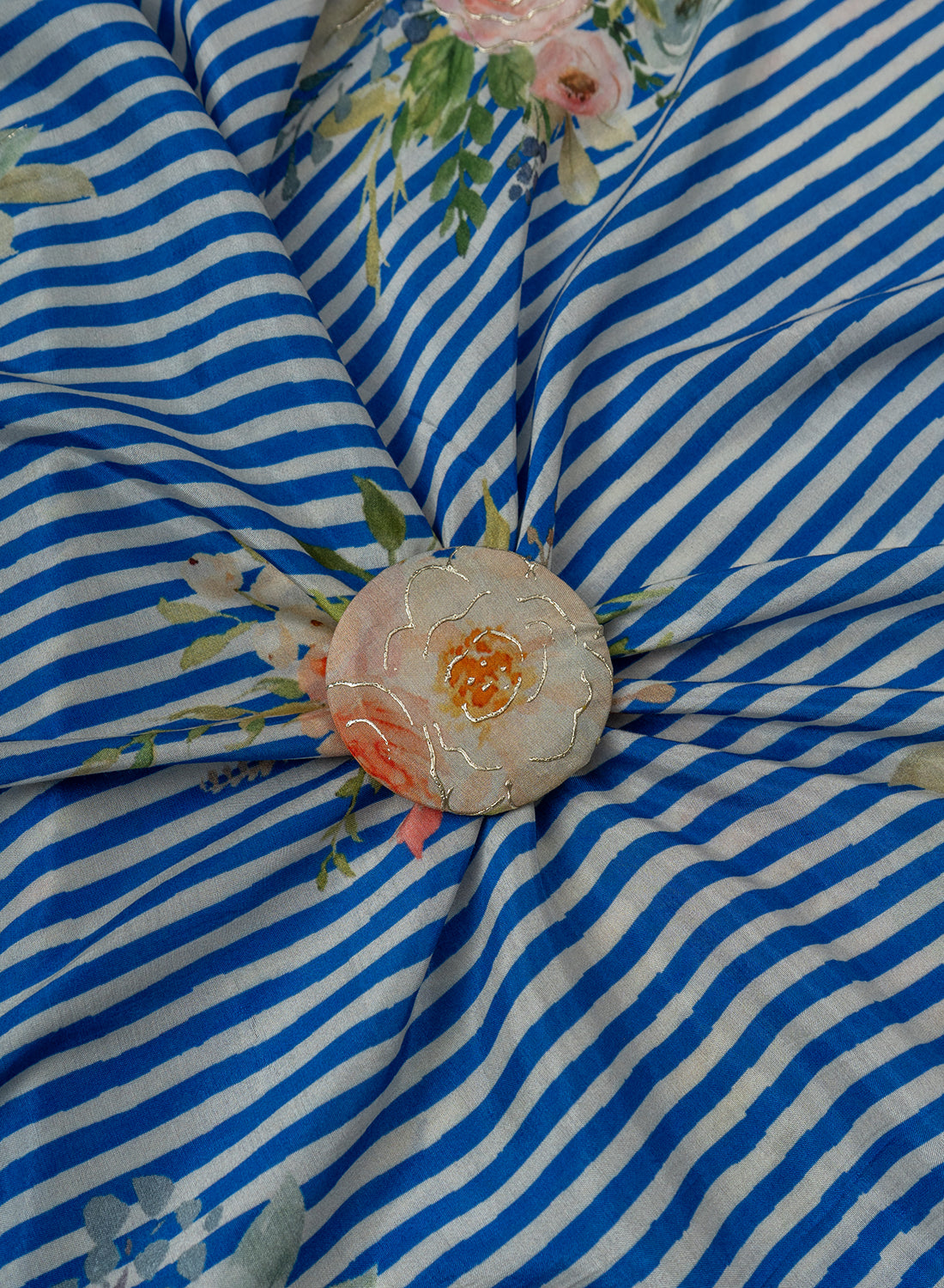 Pure Muslin Blue Color Thin Stripes Digital Printed Fabric with Kupi Work