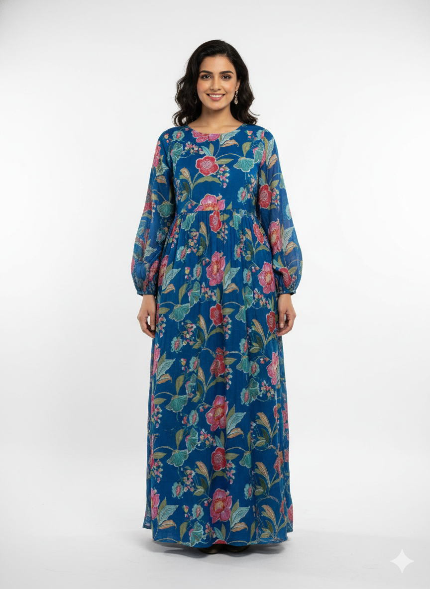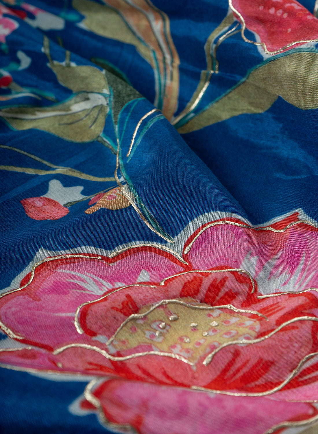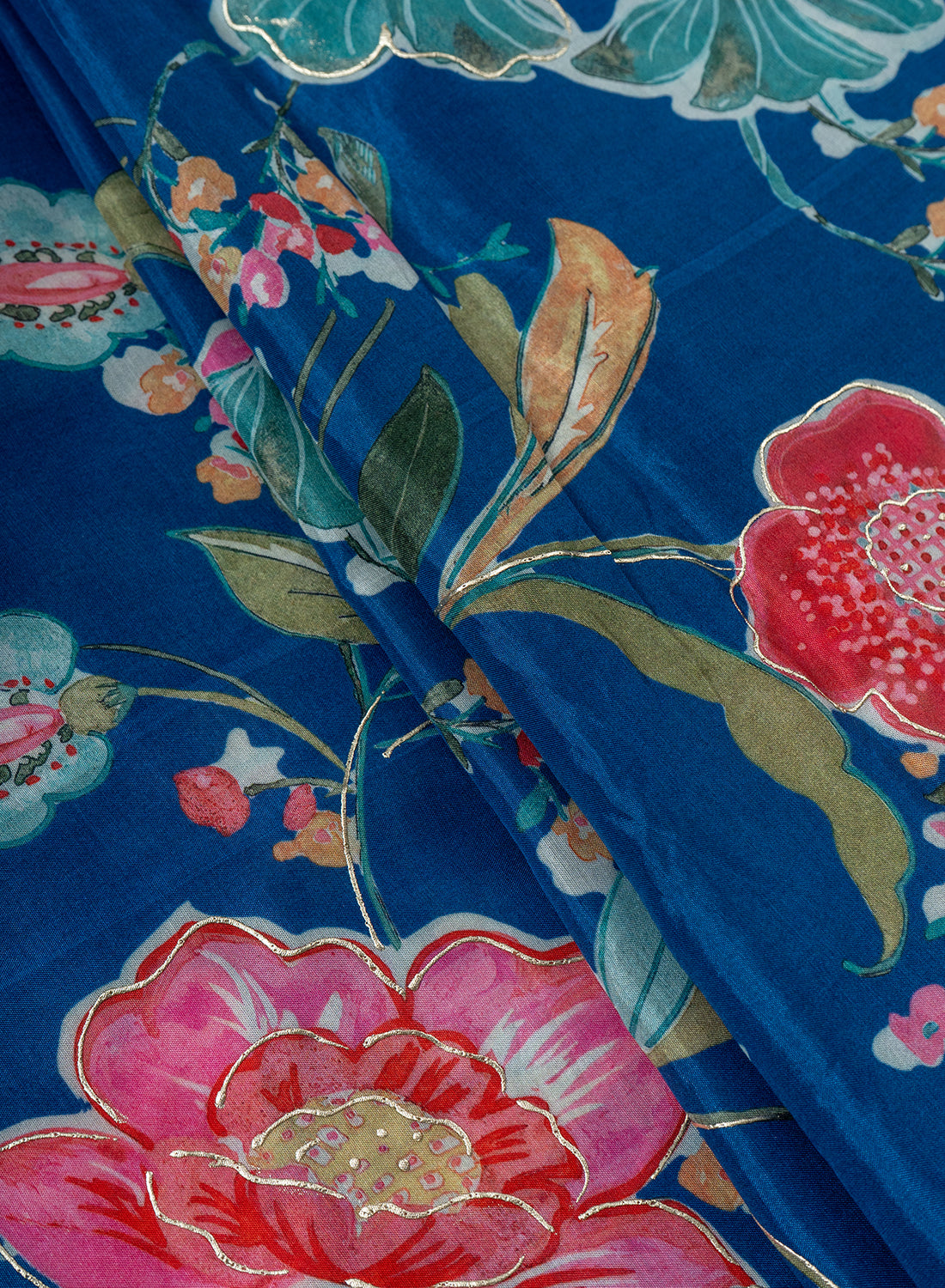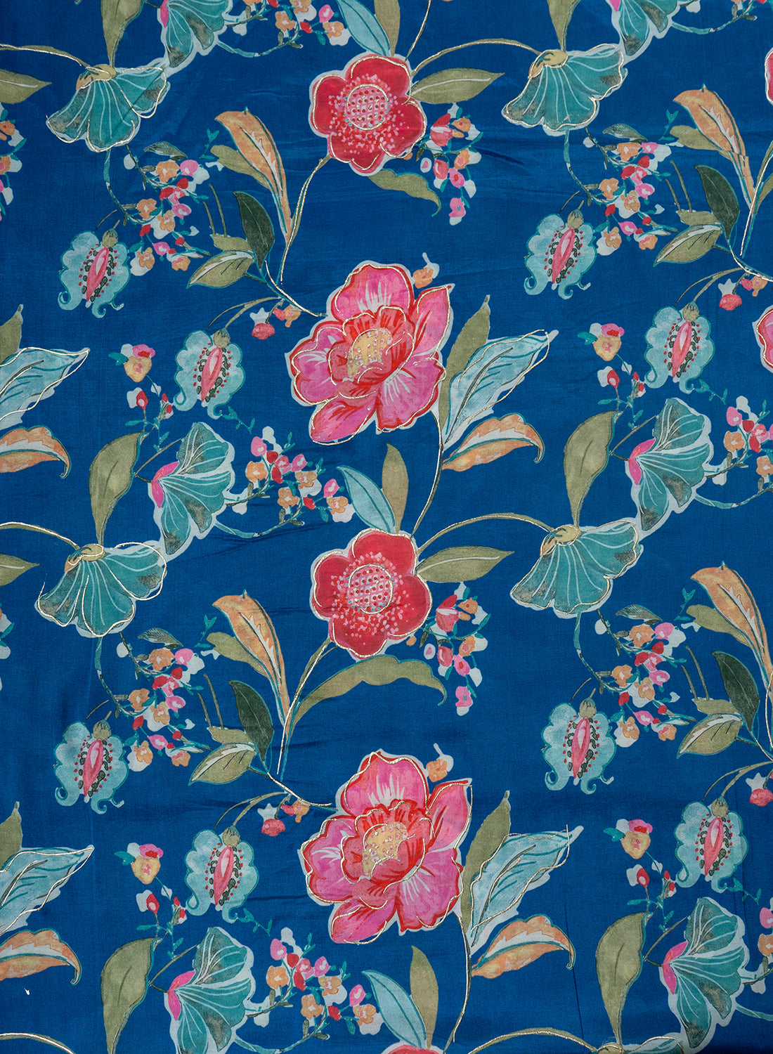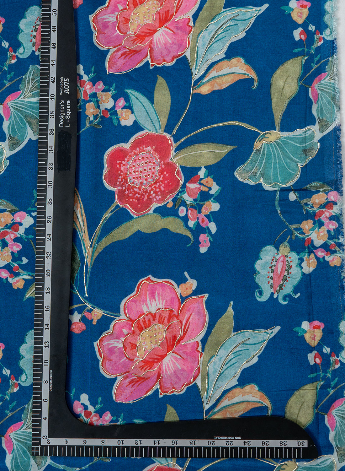 Pure Muslin Navy Blue Color Floral Digital Printed Fabric with Kupi Work