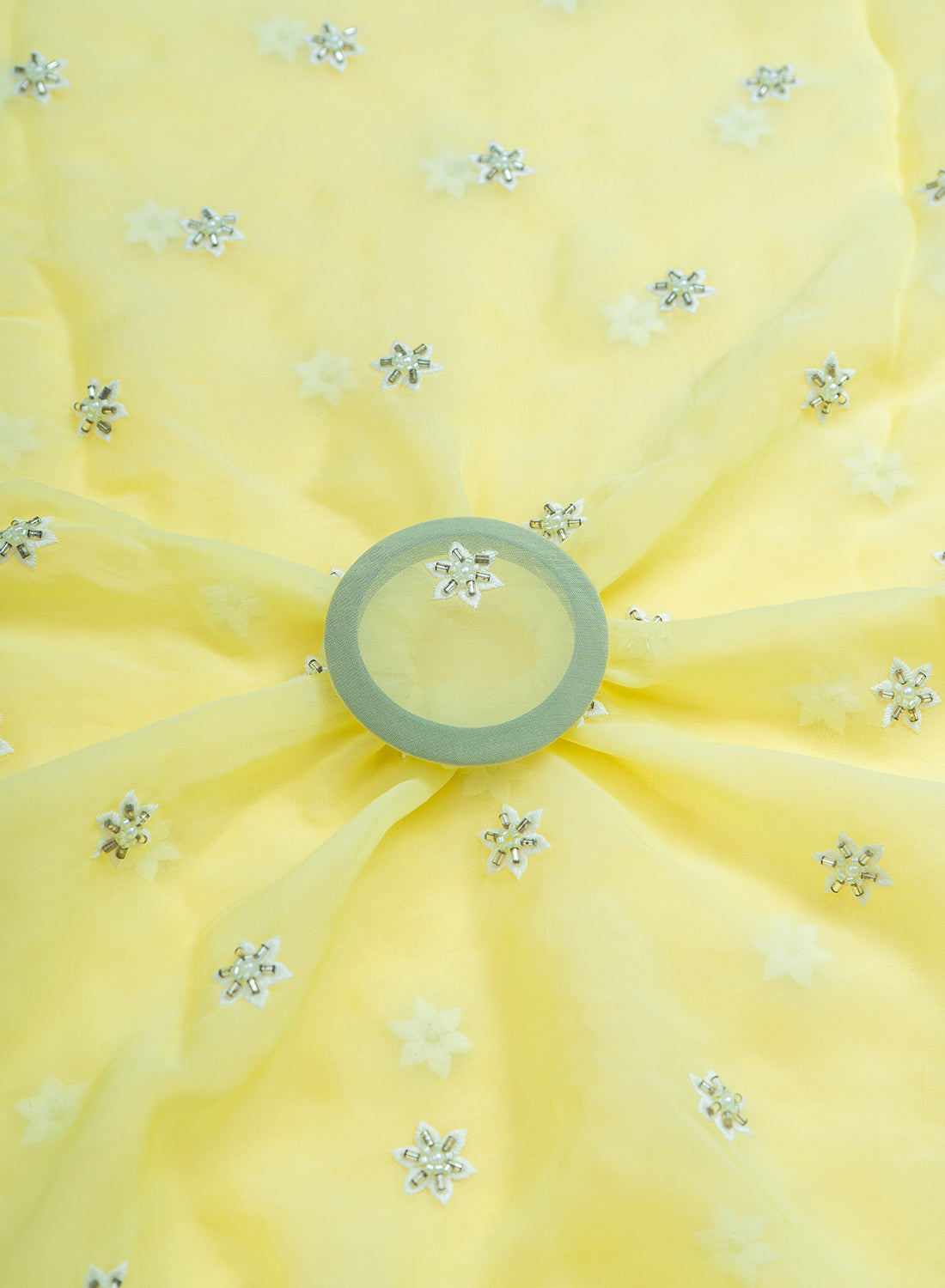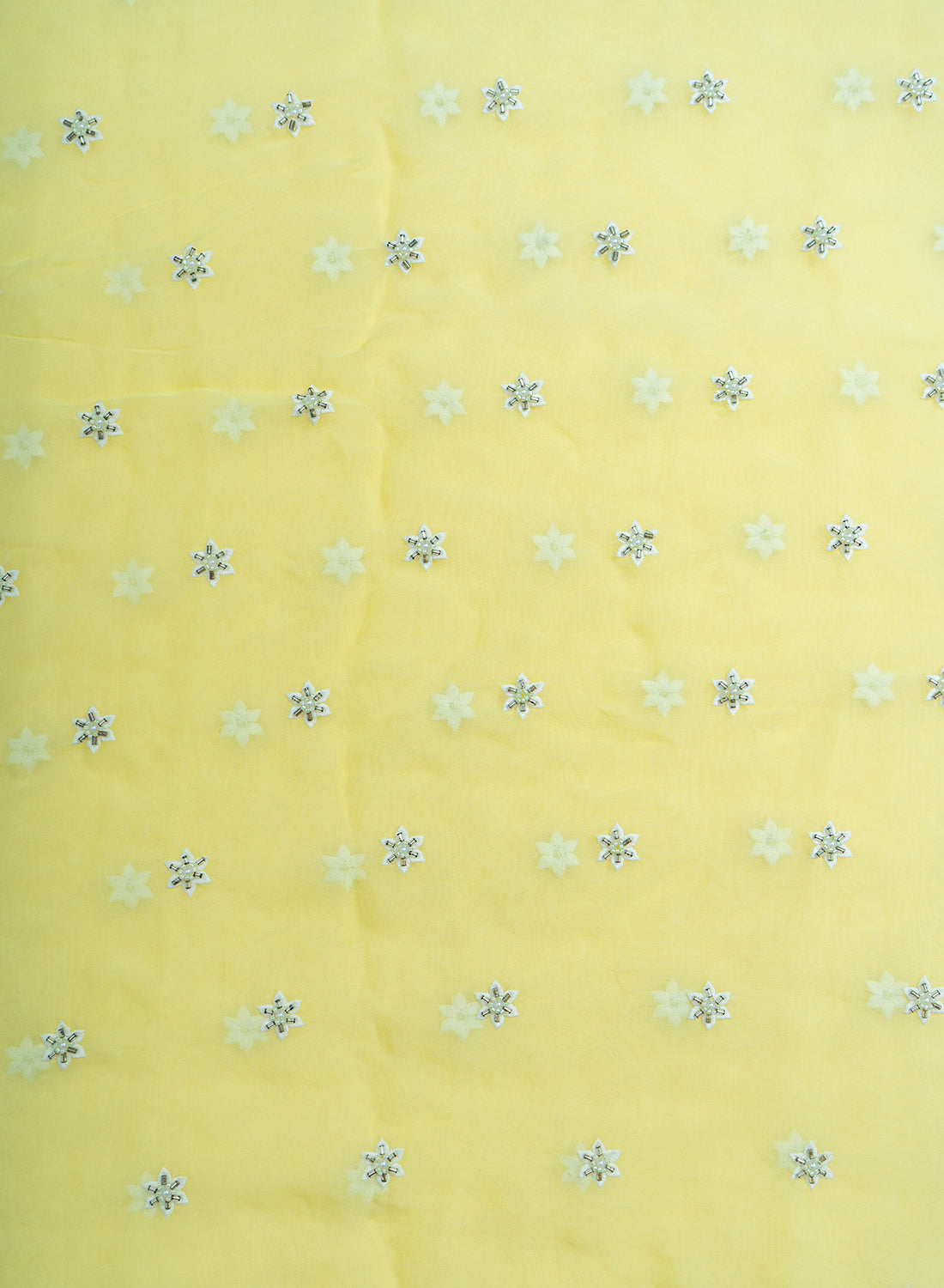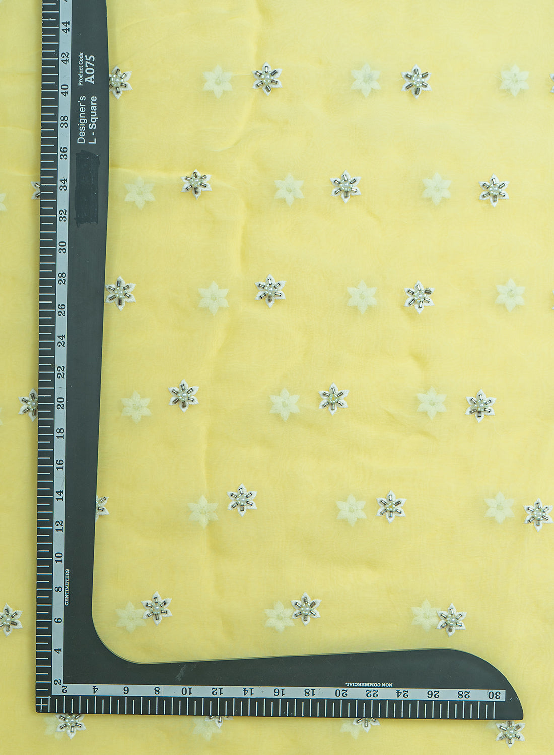 Pure Organza Light Lemon Yellow Color Saali And Pearl Embroidery Fabric.